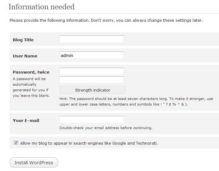Una vez editado el archivo wp-config-sample.php , lo guardamos como wp-config.php y lo subimos al directorio donde esta nuestro blog WordPress 3.0 en este caso dentro de la carpeta wp3 y volvemos a abrir nuestro navegador con la url de instalacion www.tudominio.com/wp3/wp-admin/install.php donde nos aparece la siguiente pantalla, nombre del blog, usuario y contraseña y hacer login, no nos pedira mas datos porque ya se lo hemos informado en nuestro archivo wp-config.php