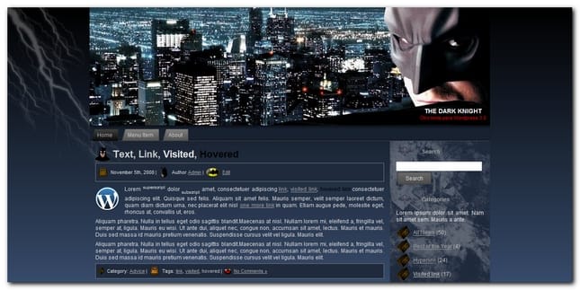 The Dark Knight Theme versión WordPress 3.0.1 es la plantilla temática para los Fans del Hombre Murcielago.