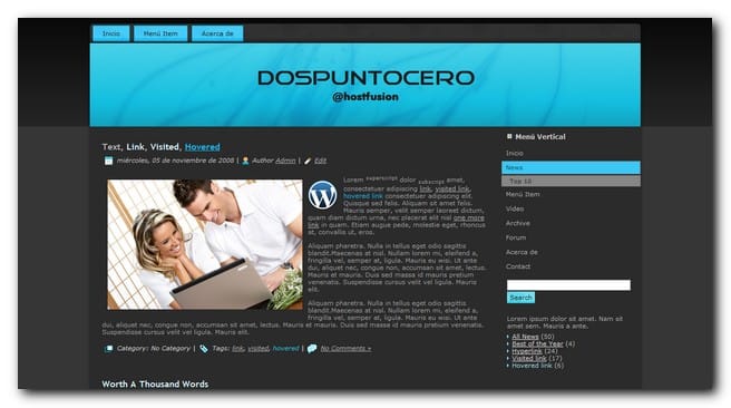 Nuevo theme mas premium que nunca para WordPress 3.2.o , DosPuntoCero, dos columnas, bog a la izquierda, sidebar a la derecha, colores negro y azul.