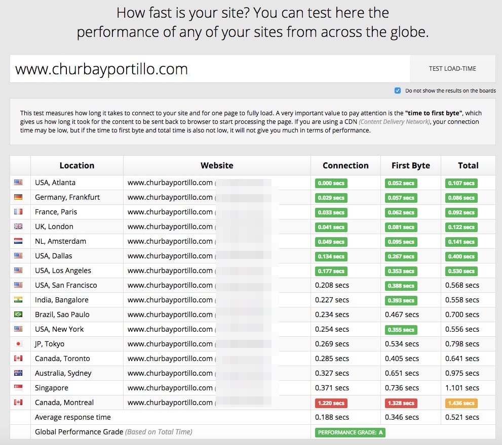 Preferimos hacer mas test con otras herramientas, para medir, el tiempo de conexión, tiempo del primer byte (TTFB) y tiempo total de carga desde varias ubicaciones, obteniendo una media de carga global. Los resultados hablan por si solos:
